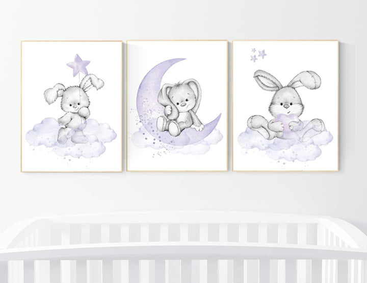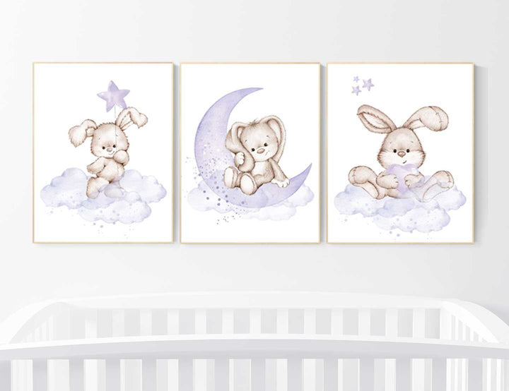 Bunny nursery wall art, girl nursery decor, purple nursery decor, lilac nursery decor girl, lavender nursery, rabbit nursery art, set of 3
