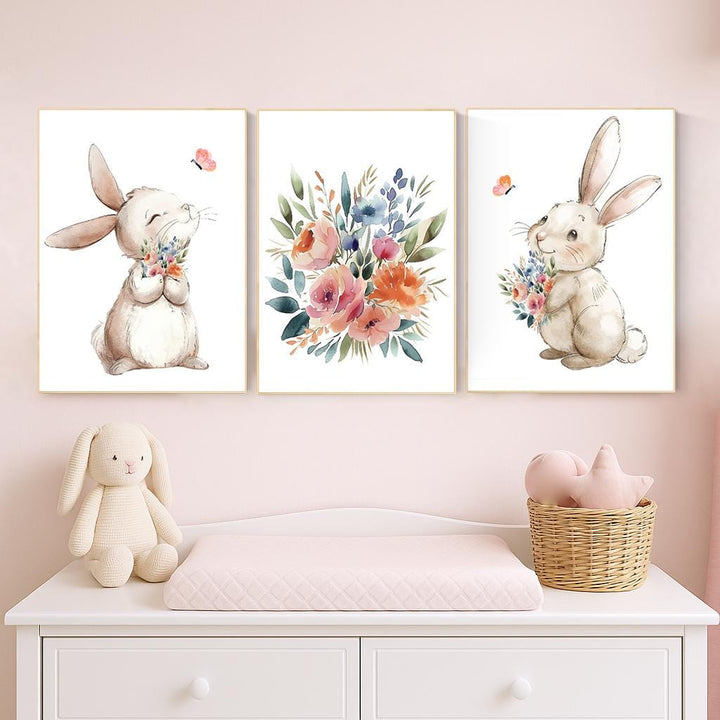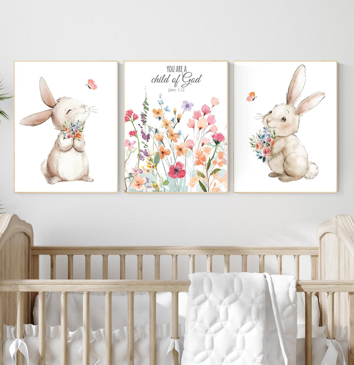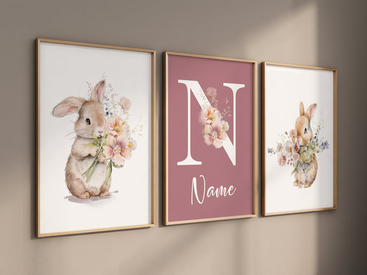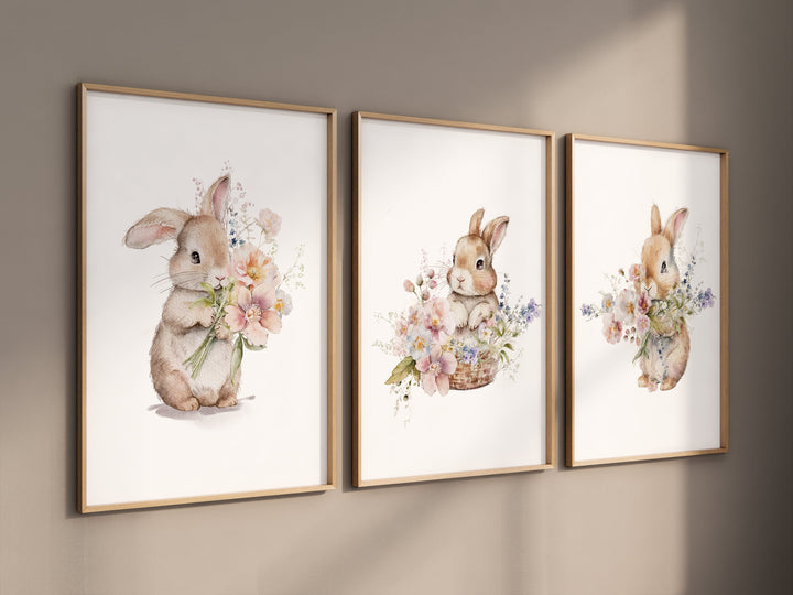 Bunny Nursery Wall Art – Set of 3 Prints with Rabbits and Flowers, Watercolor Baby Girl Room Decor, Spring Pastel Animal Posters