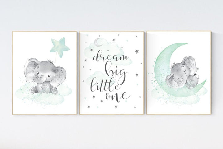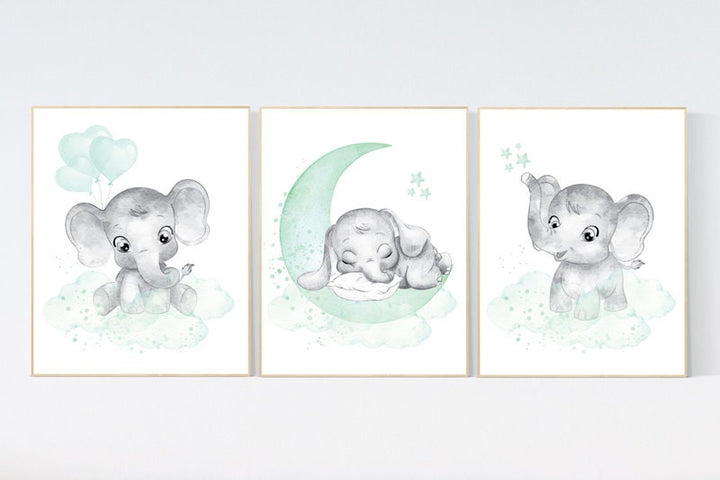 Elephant nursery art, elephant nursery print, mint nursery decor, moon and stars, baby room wall art, gender neutral, aqua, mint green