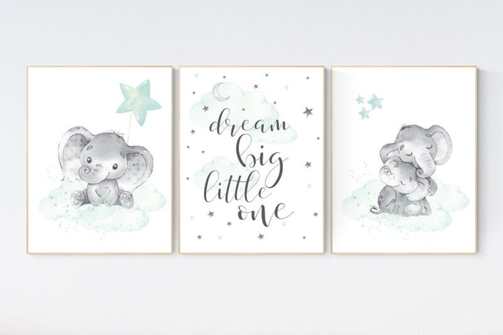 Elephant nursery art, elephant nursery print, mint nursery decor, cloud stars nursery gender neutral