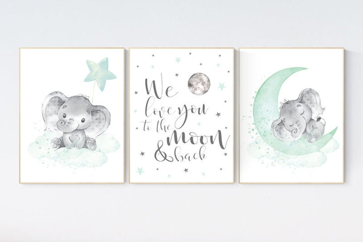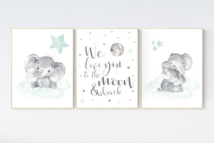 Elephant nursery art, elephant nursery print, mint nursery decor, we love you to the moon and back, gender neutral, aqua, moon and stars