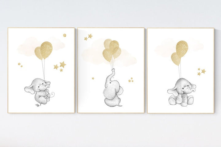 Elephant balloon print, nursery wall art elephant, gold nursery decor, gold nursery art, gender neutral baby room, Gold nursery wall art