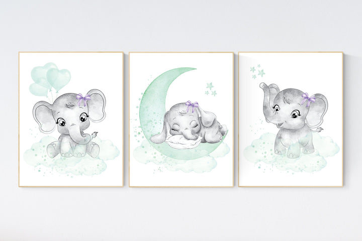 Elephant nursery art, elephant nursery print, mint and purple nursery decor, cloud and stars nursery, baby room , girl nursery, mint green