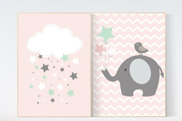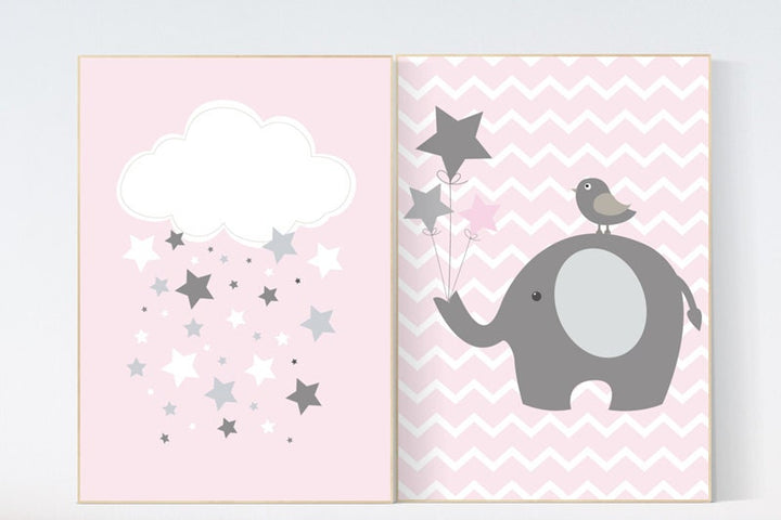 Elephant nursery art, twin nursery, elephant nursery print, pink and gray nursery, cloud and stars nursery, baby room decor girl