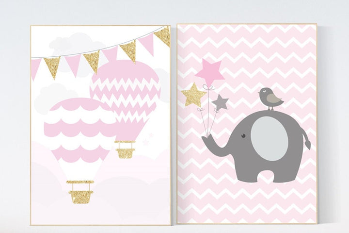 Elephant nursery decor, pink gold nursery, hot air balloon nursery, Baby girl nursery decor, girls room wall art baby girl nursery girls
