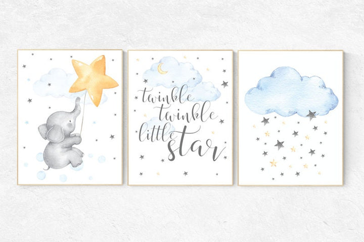 Elephant nursery art, Twinkle Twinkle Little Star, Baby boy nursery decor, Blue gray nursery, boys room wall art, baby room, set of 3