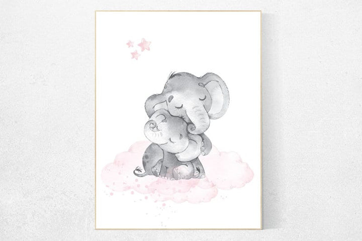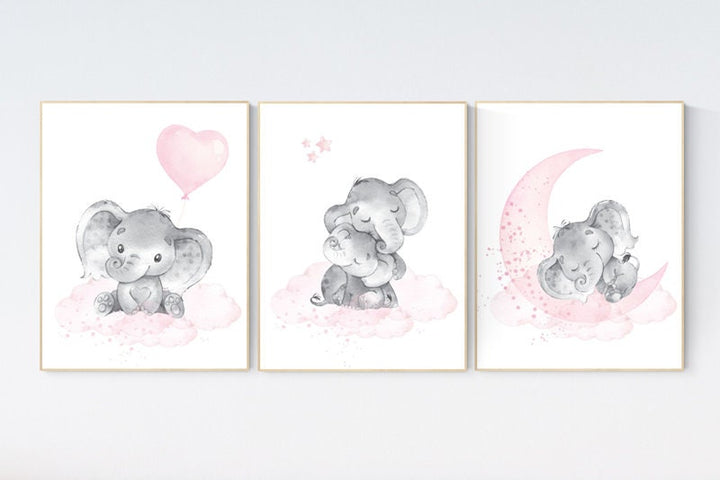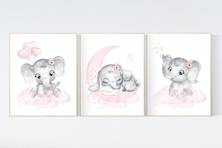 Elephant nursery decor, cloud nursery decor, baby girl nursery decor, pink nursery decor, girls room wall art, nursery prints girl baby gift