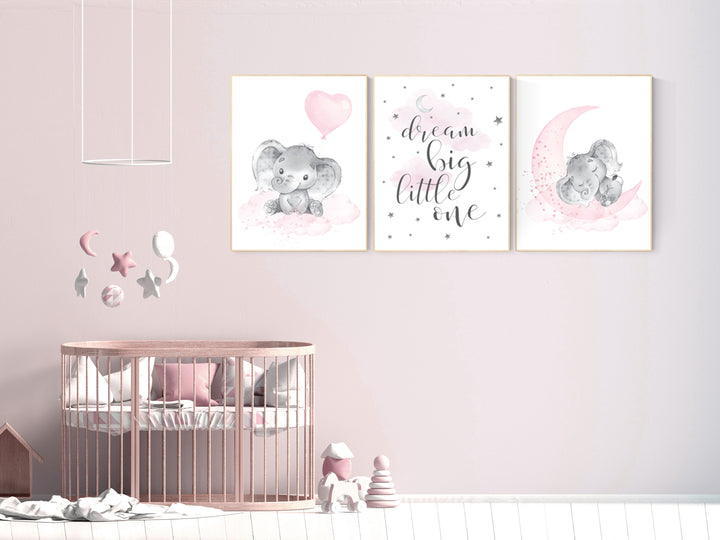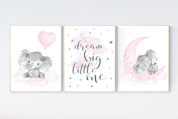 Elephant nursery art, nursery decor girl, pink and gray, cloud and stars, baby room decor girl, nursery prints girl, dream big little one