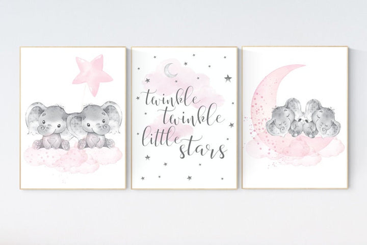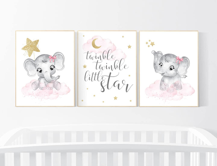Elephant nursery art, elephant nursery print, pink and gold, Nursery wall art girl elephant, twinkle twinkle little star, nursery decor girl