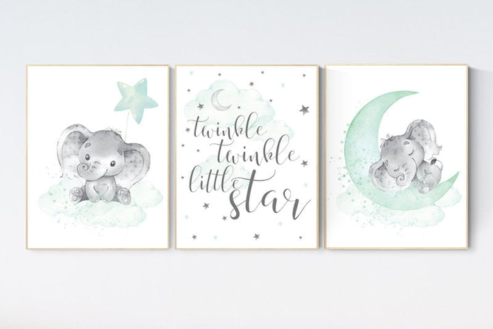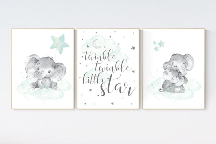 Elephant nursery decor, twinkle twinkle little star, Mint nursery decor, nursery decor neutral, nursery decor boy teal, cloud and star