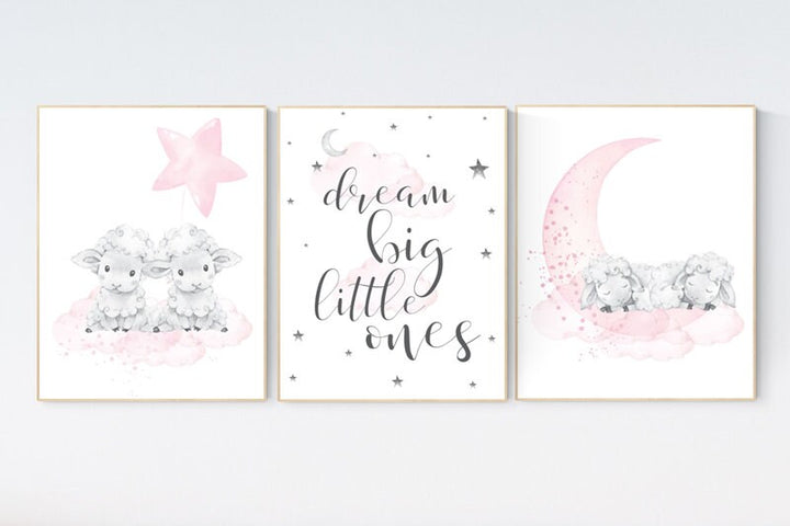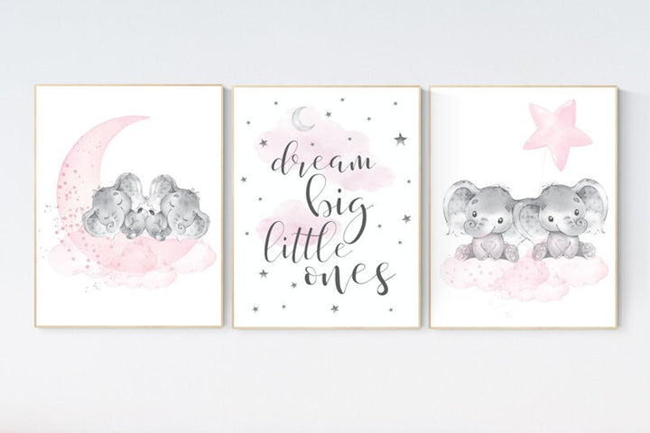 Elephant nursery art, twin nursery decor, elephant nursery print, twin nursery art, moon and stars, pink nursery, twin babies, pink grey