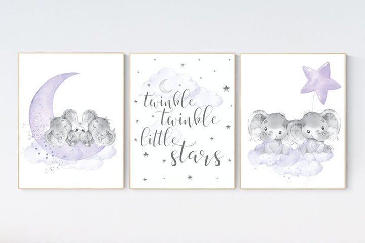 Elephant nursery art, twin nursery, elephant nursery print, lavender nursery, cloud and stars nursery, baby room decor girl, purple nursery