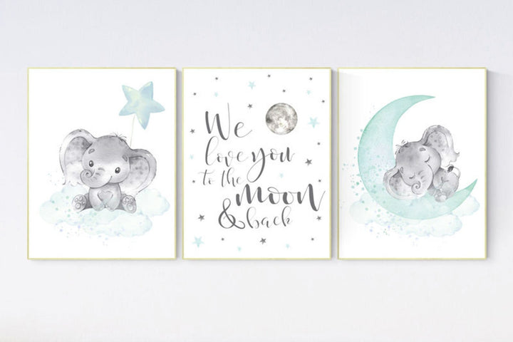 Elephant nursery art, elephant nursery print, teal nursery decor, we love you to the moon and back, gender neutral, teal, moon and stars