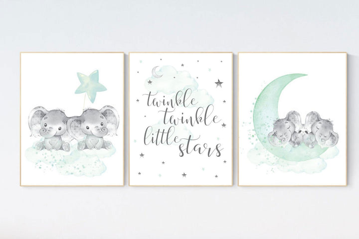 Elephant nursery art, twin nursery decor, elephant nursery print, twin nursery art, moon and stars, mint nursery, twin babies, mint green