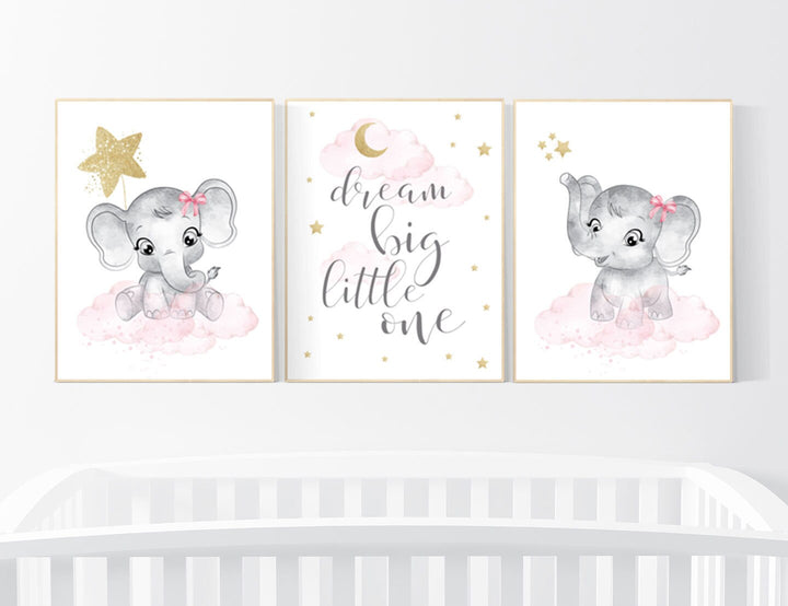 Elephant nursery art, elephant nursery print, pink and gold, Nursery wall art girl elephant, dream big little one, nursery decor girl