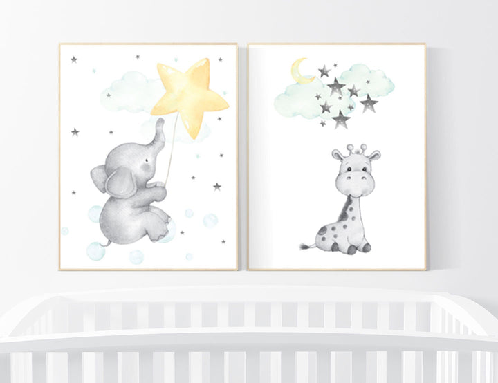 Elephant nursery art, giraffe nursery, mint yellow nursery, neutral nursery prints, cloud nursery, star nursery decor, gender neutral