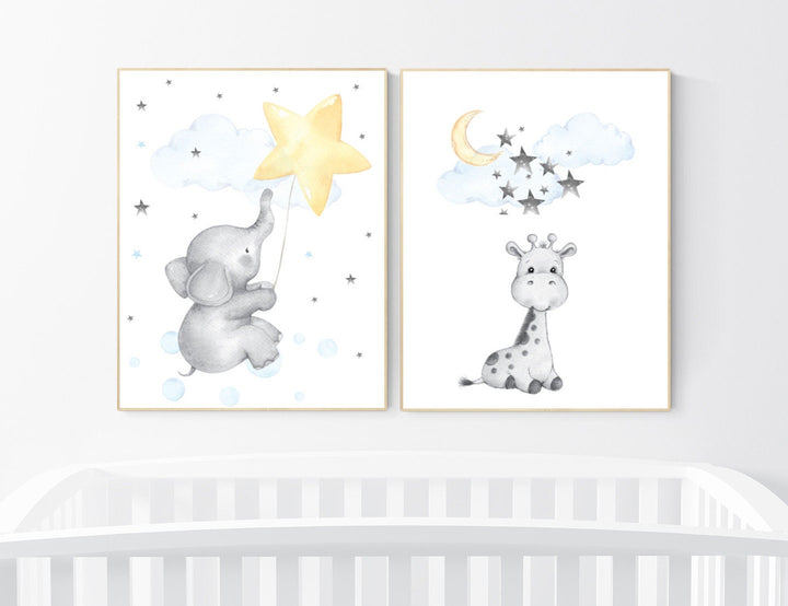 Elephant nursery art, giraffe nursery, blue yellow nursery, neutral nursery prints, cloud nursery, star nursery decor, gender neutral