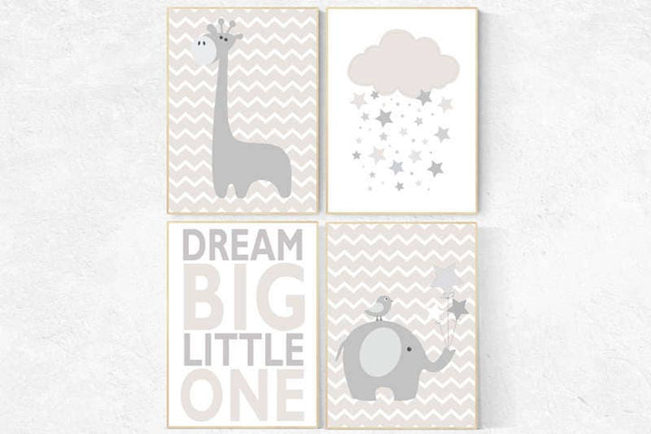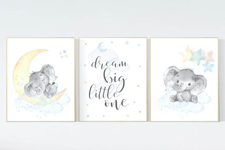 Gender neutral nursery, elephant nursery. nursery decor neutral, cloud and stars, baby room art, dream big little one, gender neutral