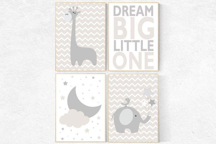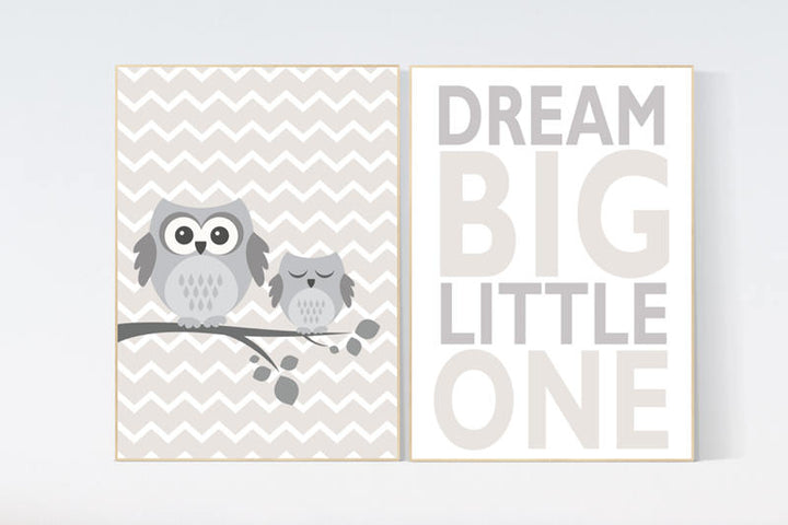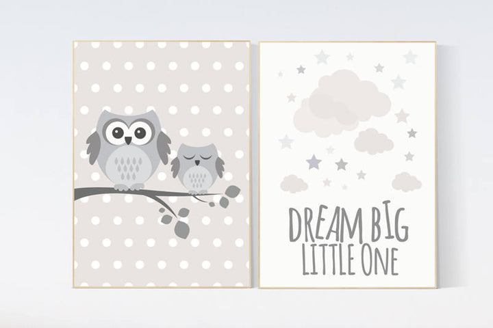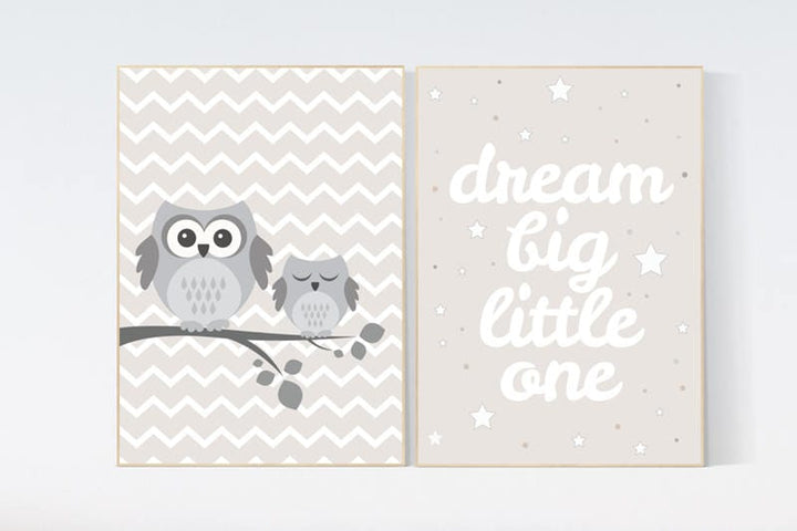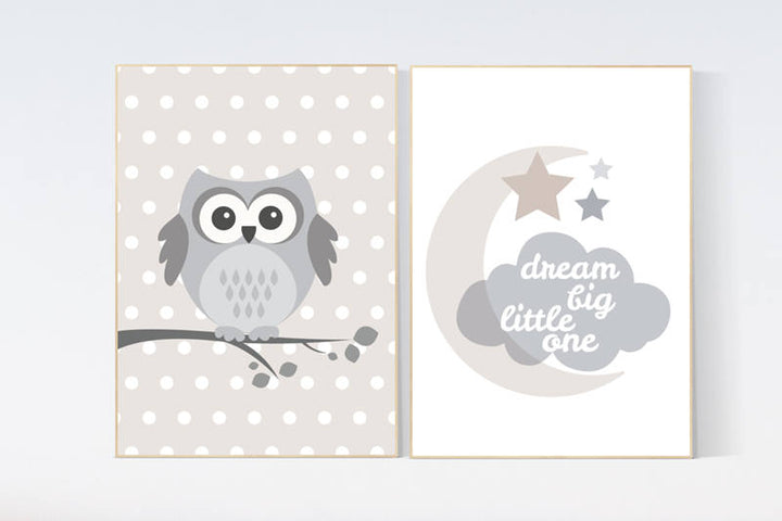 Gender neutral nursery, dream big little one, beige and cream, Nursery Decor, Gray Beige, nursery prints, Owl nursery wall art nursery decor