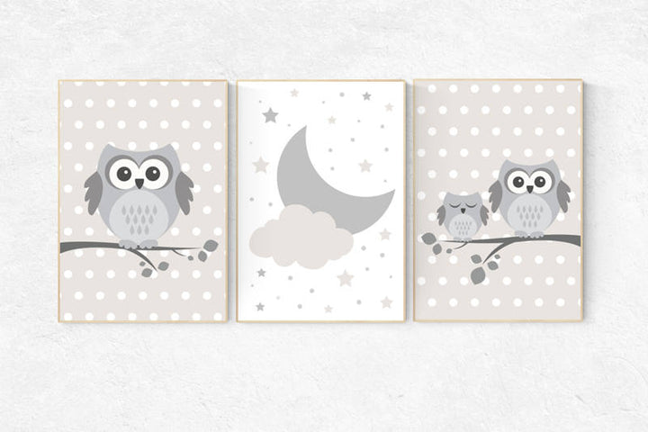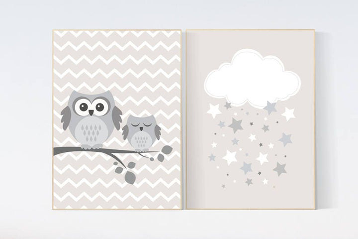 Gender neutral nursery, neutral nursery wall art, neutral nursery prints, owl nursery decor, owl print nursery, gray nursery cloud and stars