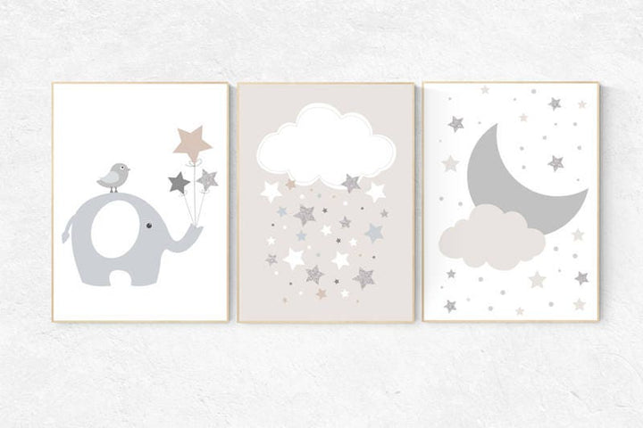 Gender neutral nursery, elephant nursery wall art, moon and stars, gender neutral, beige nursery art, baby room decor, neutral colors