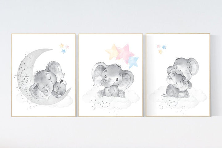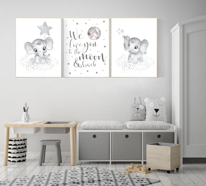 Gender neutral nursery, Grey nursery wall art, elephant nursery wall art, gray nursery art, nursery wall decor, moon, stars, neutral