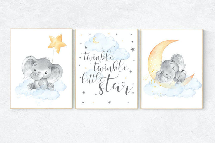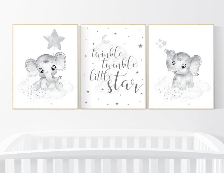 Gender neutral nursery, elephant nursery. nursery decor neutral, cloud and stars, baby room art, Twinkle twinkle little star, gender neutral