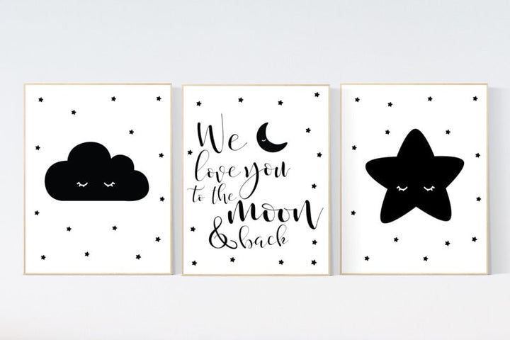 Gender neutral nursery, Black and white nursery, Moon Cloud Stars, Cloud and Star, black and white, we love you to the moon and back