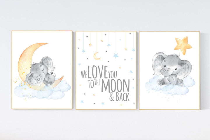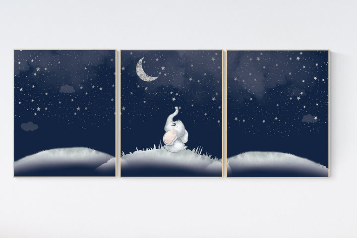 Gender neutral nursery, elephant nursery, Nursery decor neutral, moon and stars, nursery decor sets, nursery decor boy stars, sky, set of 3