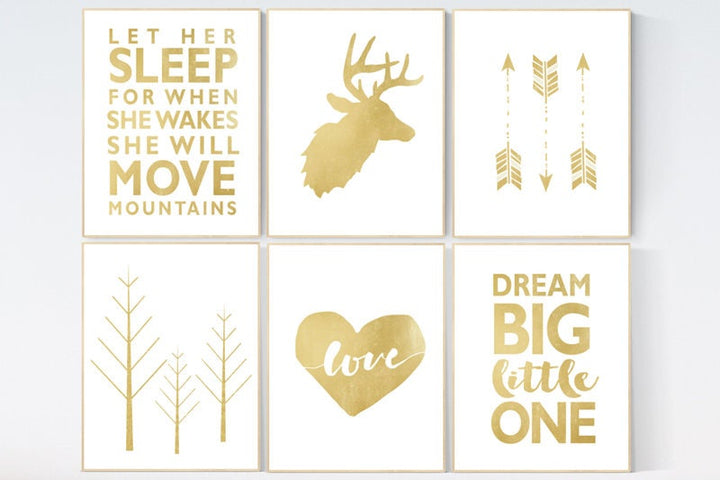 Gold nursery decor, gold girl nursery, let her sleep, adventure nursery decor, adventure nursery prints, dream big, nursery decor gold