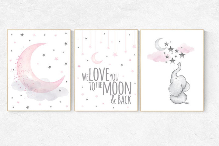 Girls room decor, Nursery decor girl pink and gray, nursery decor girl pink, Elephant nursery, we love you to the moon and back, moon stars