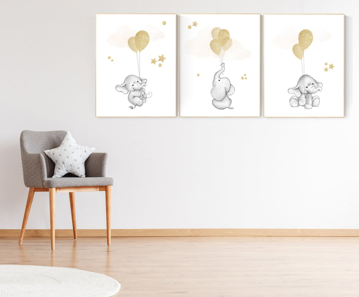 Gold nursery wall art, elephant balloon print, nursery wall art elephant, gold nursery decor, gold nursery art, gender neutral baby room
