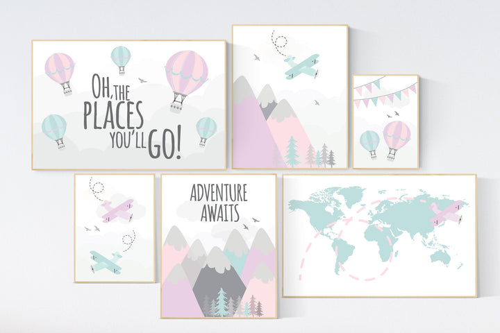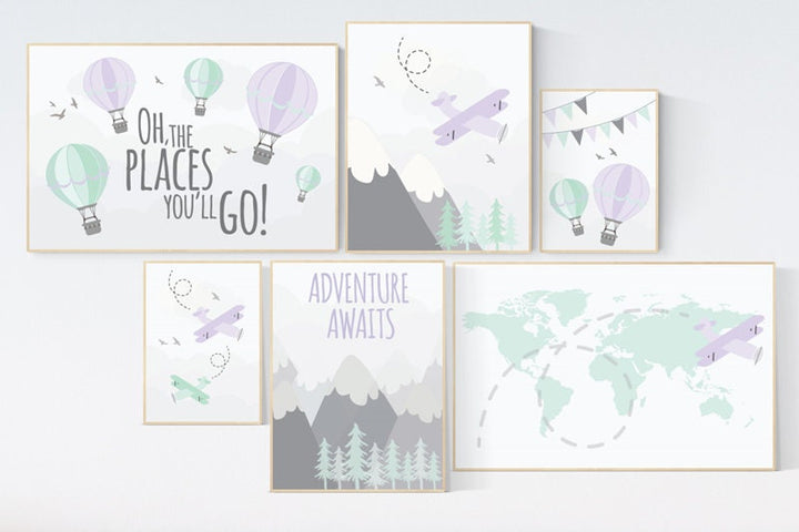 Girls room decor purple and turquoise, adventure awaits nursery art, adventure theme nursery, lavender mint, lilac mint hot air balloon