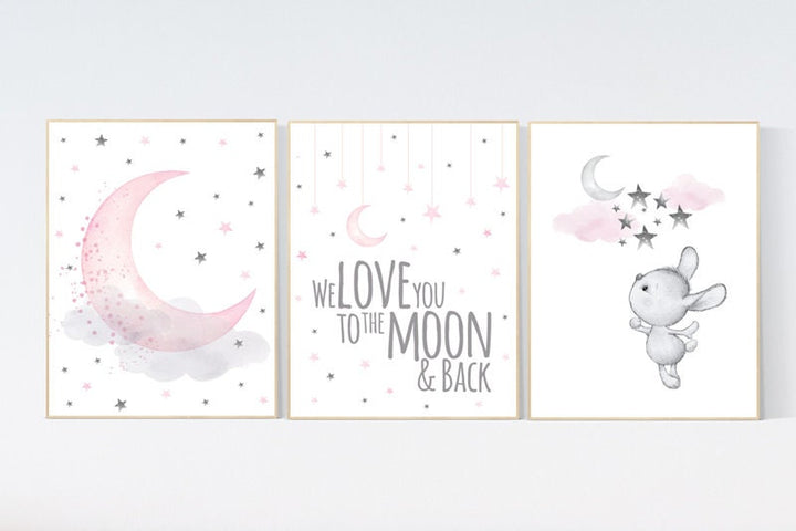 Girls room decor, Nursery decor girl pink and gray, nursery decor girl pink, Bunny nursery, we love you to the moon and back, rabbit nursery