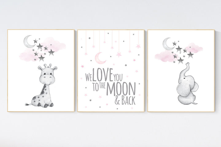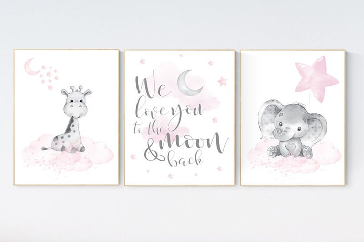 Girls room decor, Nursery decor girl pink and gray, nursery decor girl pink, Elephant and giraffe nursery, we love you to the moon and back