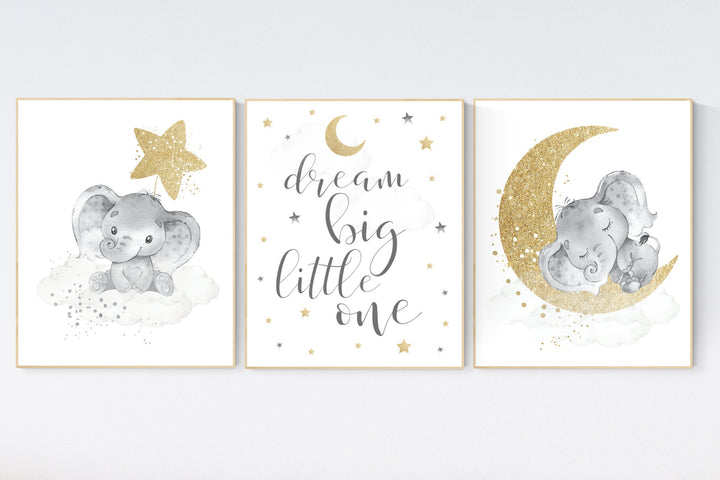 Gold nursery decor elephant, gold nursery, cloud and stars, moon and stars, baby room wall art, gender neutral, gold grey, elephant nursery