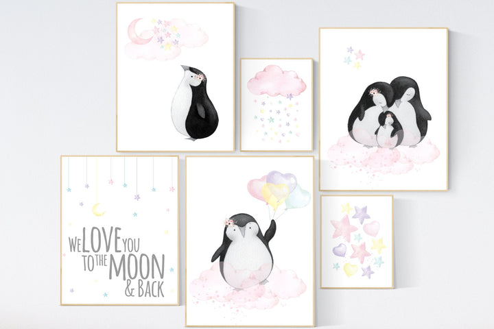 Girl room decor, penguin prints, pink, purple, teal, yellow , penguin, penguin nursery, moon and stars, girl room decor girl, pastel colors