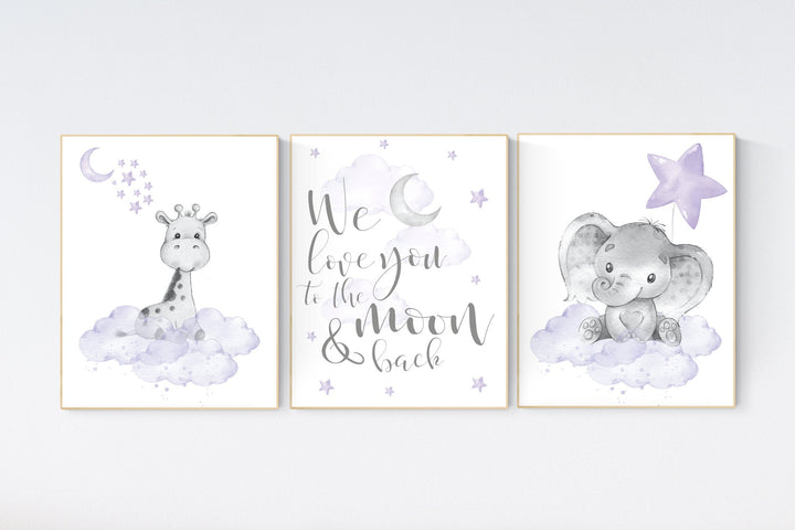 Girls room decor, Nursery decor girl lavender and gray, nursery decor girl purple, Elephant and giraffe, we love you to the moon and back