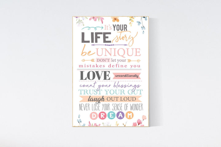 Girl wall art, Girl bedroom art, quote print, it's your life story, teen room, girls room decor, flower print, girls quote decor