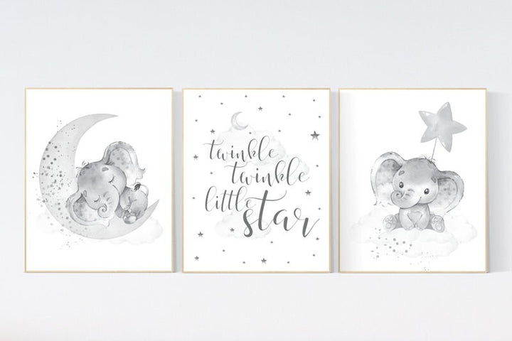 Grey nursery wall art, gender neutral, elephant nursery wall art, moon and stars, gray nursery art, baby room decor, neutral, twin nursery