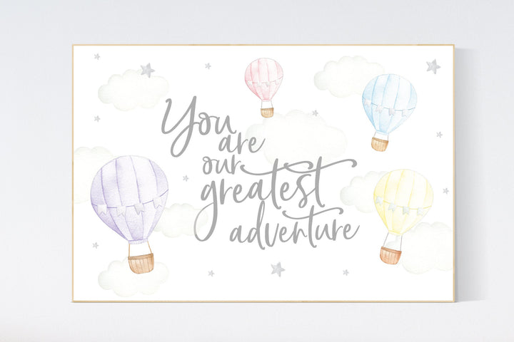 Hot air balloon nursery, gender neutral, pastel color, you are our greatest adventure, twin nursery, unisex, pink, blue, yellow, purple