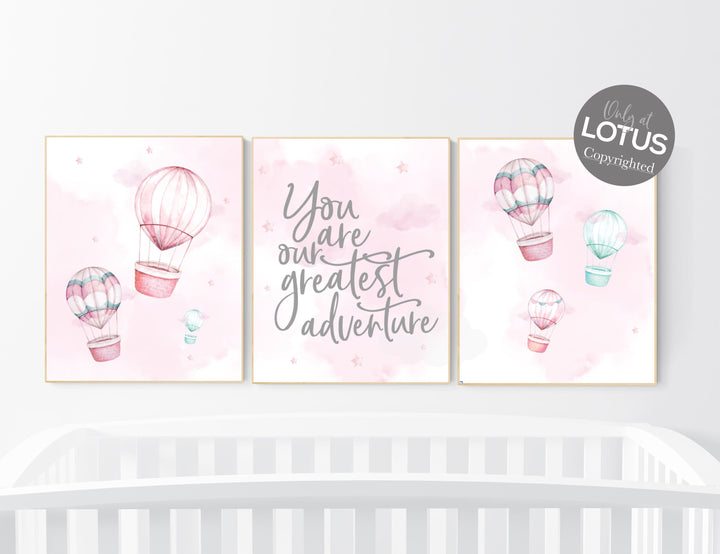 Hot air balloon nursery girls, Nursery decor girl, hot air balloon art for nursery, pink nursery prints, pink and teal, girls room decor