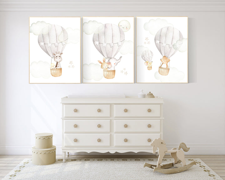 Hot Air Balloon Nursery Wall Art, Neutral Baby Room Decor, Safari Animal Prints, Adventure Theme, Watercolor Baby Animal Artwork
