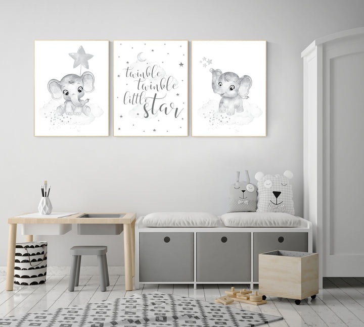 Grey nursery wall decor, gray nursery, elephant, nursery decor gender neutral, baby room art