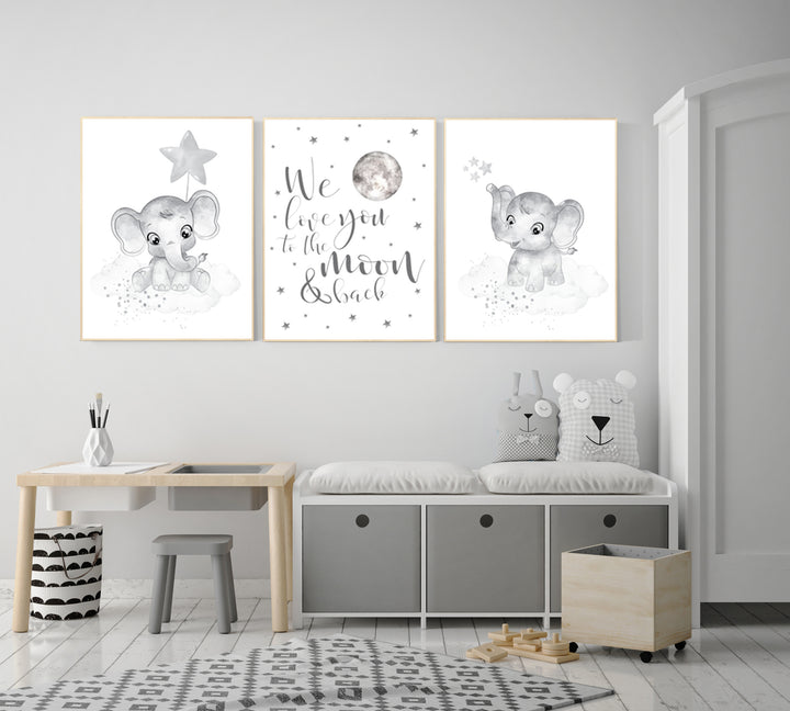 Grey nursery wall art, elephant nursery wall art, moon and stars, gender neutral, gray nursery art, baby room decor, neutral, twin nursery