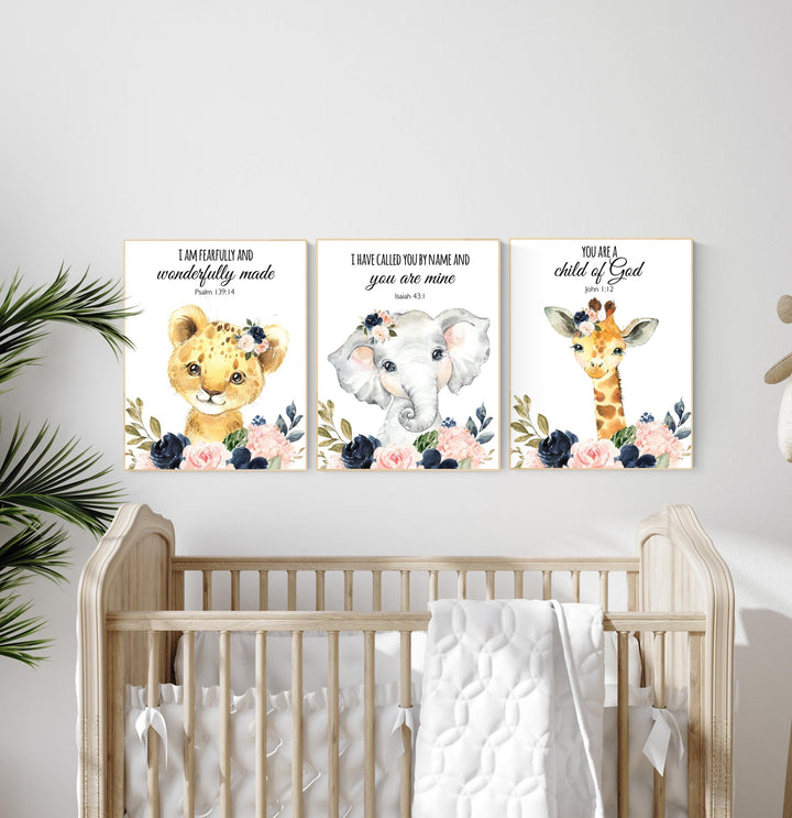 Jungle Animals, Safari Animal Nursery Prints, safari animals, safari nursery, navy and blush, girl nursery, verse nursery, bible verse