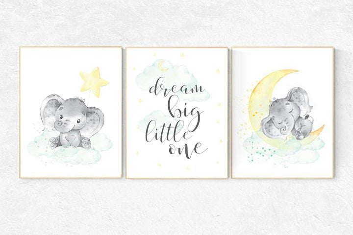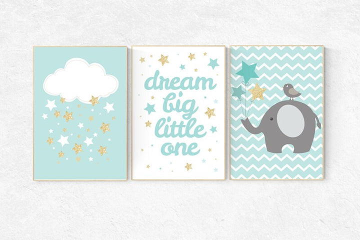 Mint gold nursery, dream big little one, elephant nursery, Mint gold nursery baby shower, set of 3, cloud nursery wall art, nursery wall art