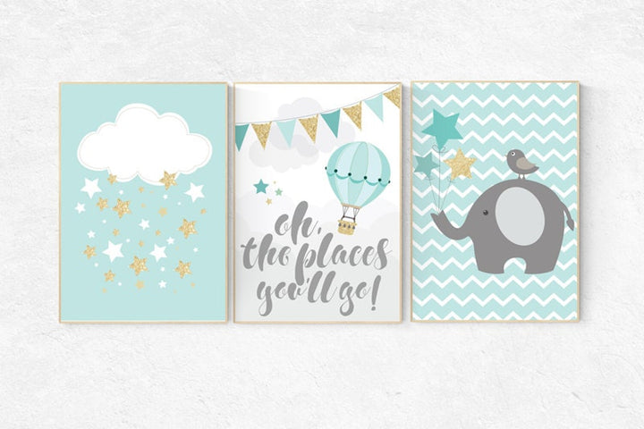 Mint gold nursery, oh the places you'll go, elephant nursery, Mint gold nursery baby shower, set of 3, cloud nursery wall art