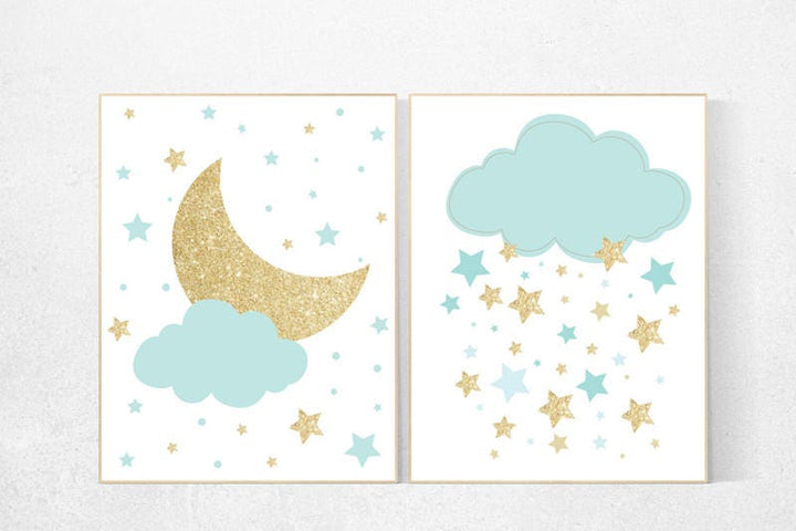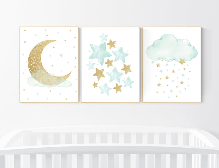 Mint gold nursery decor, stars, moon, cloud, nursery wall art mint, gender neutral nursery, mint green nursery, cloud nursery