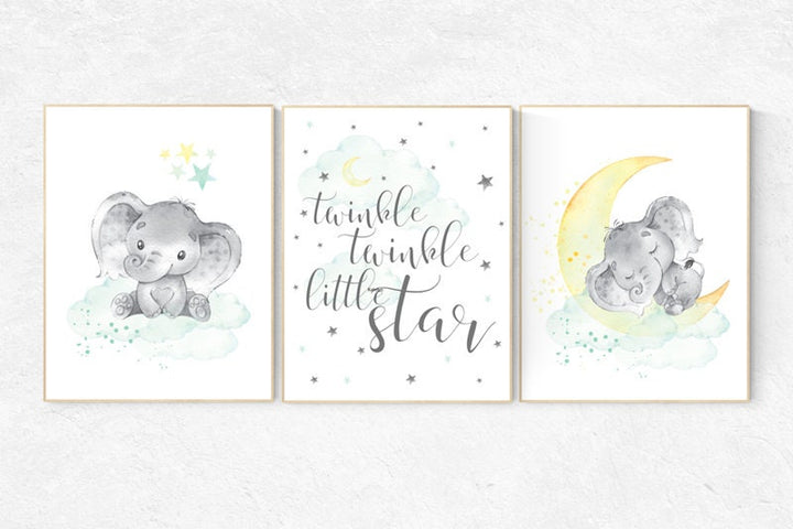 Mint and yellow nursery, nursery decor elephant, nursery prints, elephant nursery art, twinkle twinkle little star, mint and yellow, balloon